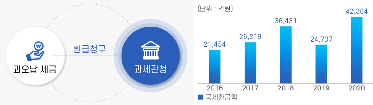 국세환급금은 2016년 2조 1,454억원에서 2020년 4조 2,364억원으로 2조 910억원 증가했습니다. (국세통계포털TASIS 2021년) 많은 분들이 경정청구를 통해 과오납된 세금을 돌려받고 있습니다.