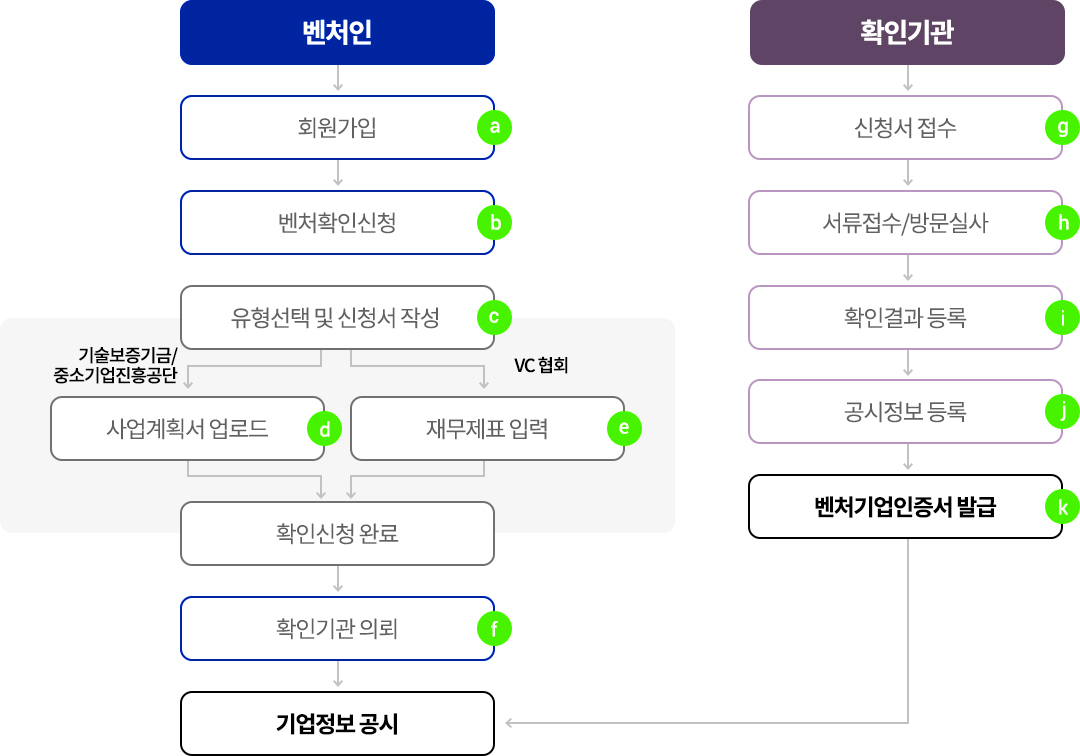 벤처인(회원가입)→벤처확인 신청(사업계획서 업로드/재무제표 입력)→서류접수/방문실사 → 벤처기업인증서 발급